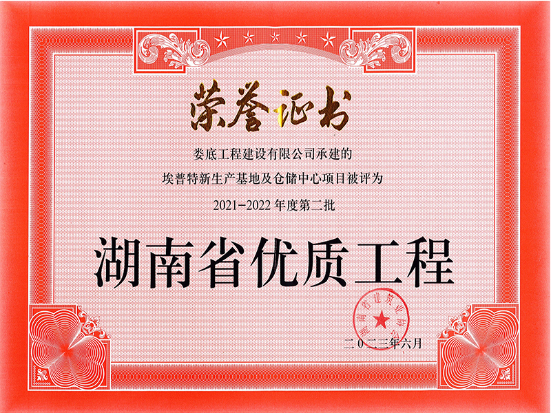 2021-2022年度埃普特新生產基地及倉儲中心項目第二批湖南省優質工程榮譽證書