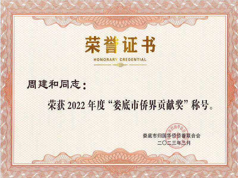 周建和榮獲2022年婁底市僑界貢獻獎榮譽證書