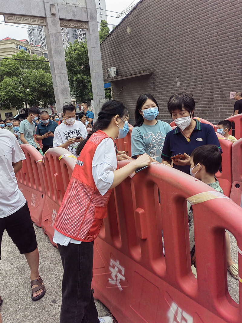 在核酸檢測現場,志愿者們與工作人員一同引導居民們按順序依次進行核酸檢測,認真核對好檢測人員的身份信息并進行錄入,做到規范、科學、快速有序開展登記和檢測工作,做好檢測人員的銜接,最大限度提高檢測工作效率,確保全民檢測工作有序開展。